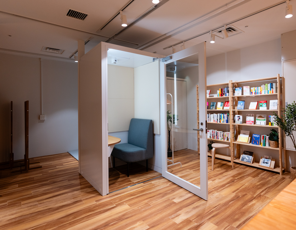 ラウンジエリアのみ小さなお声で会話が可能です。また、フォンブース内はビデオ会議や通話が可能です。
